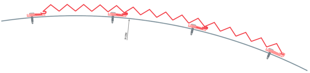 PREFA extruded profiles can also be installed on rounded subsurfaces even with vertical profile installation. For the construction width of 200 mm, the minimum radius of r ≥ 1,250 mm must be observed.
