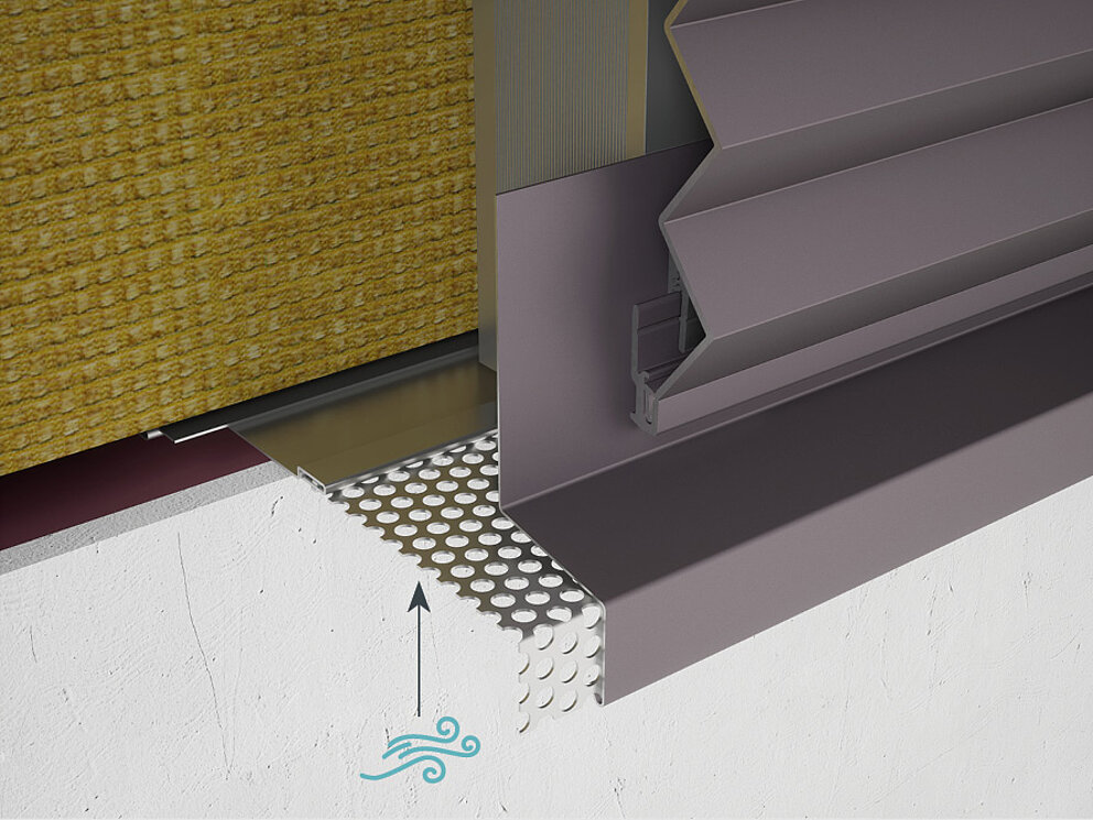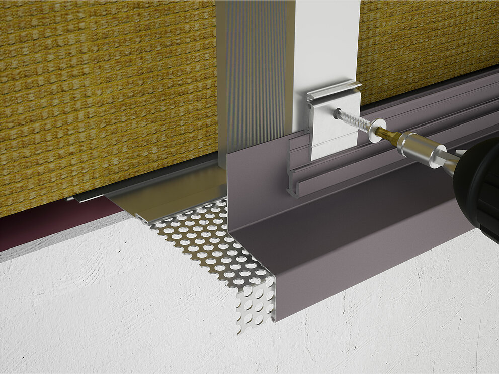 Once the bottom detail (perforated and drip edge flashing) has been completed, the starter profile as the first component of the cladding can be installed. When erecting an extruded profile façade, the first profile is always the starter profile.