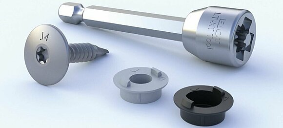 The screwed mechanical fastening system consists of a facade screw, a special LT-XT TOOL TX 25 bit and matching fixed and sliding point bushings.