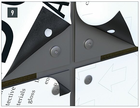 Use the PREFA ⌀ 9.5 mm film cutter to slightly score the protective film around the bore hole so that the protective film can be easily removed after the installation is complete. Otherwise, the film may become clamped between the panel and the bottom of the screw head, making it difficult to remove.