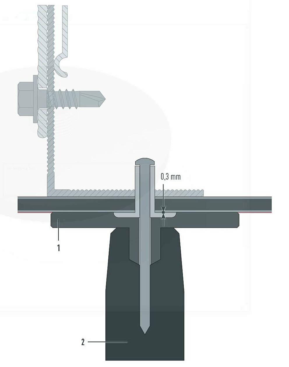 The riveted mechanical fastening system consists of a façade rivet and, if desired, a fixed point bushing.