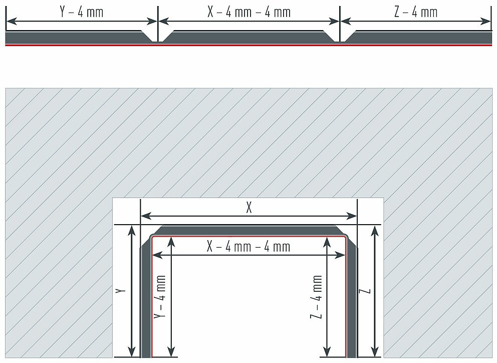 For an internal corner, the material thickness of the composite panel (4 mm) is deducted from the measured actual dimensions.