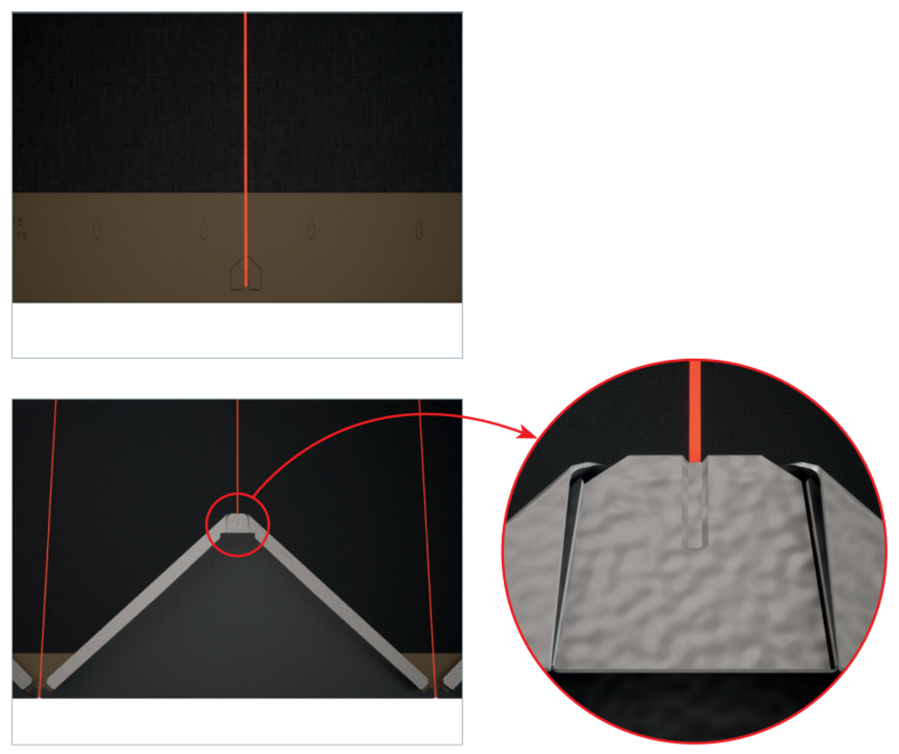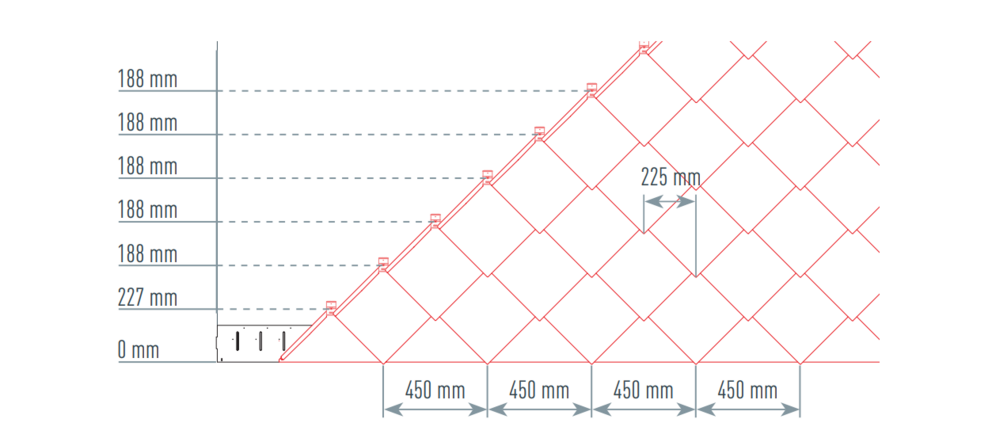 To help with the installation of the PREFA rhomboid façade tiles 29 × 29, it is advisable to create a grid of vertical lines at a distance of 450 mm (the markings in the starter strip can be used as a guide). In order to keep the dimension exact in each row, half of the layout dimension can also be marked and checked at regular intervals if necessary. Align the starting plates with the notches (on the top edge of the starting plates) on the vertical chalked lines (Figure 30). It should be noted that the area for the lateral upstand (e.g. abutment detail or building corners) is not in the centre of the 29 x 29 rhomboid façade tiles (observe symmetry of façade surface).