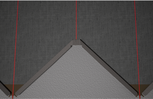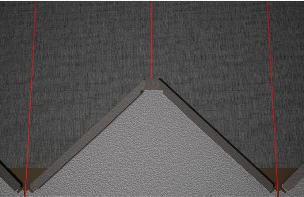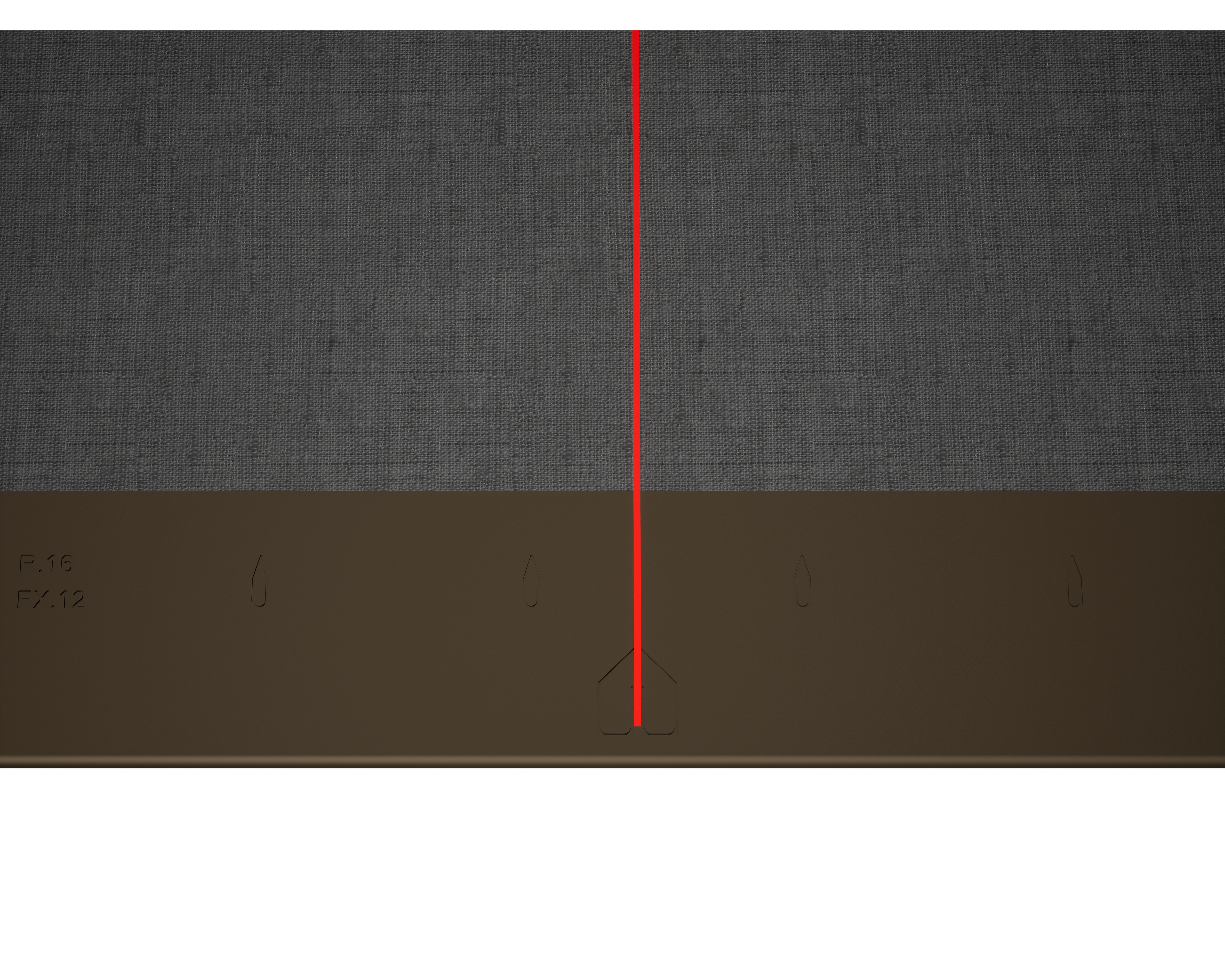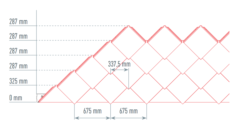 To help with the installation of the PREFA 44 x 44 rhomboid roof tiles, it is advisable to create a grid of vertical cords at a distance of 675 mm (the markings in the starter strip can be used as a guide). In order to keep the dimension exact in each row, half of the layout dimension can also be marked and checked at regular intervals if necessary. Align the starting plates with the notches (on the top edge of the starting plates) on the vertical chalked lines (Figure 30). It should be noted that the area for the lateral upstand (e.g. abutment detail or building corners) is not in the centre of the 44 x 44 rhomboid façade tiles (observe symmetry of façade surface).
