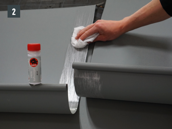 On-roof gutter joints can also executed with 20 pcs. of 4 x 9.5 mm PREFA rivets in a cross stitch version and sealed with PREFA silicone.