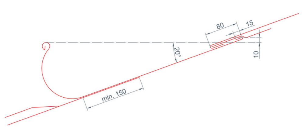 It is important to ensure that the roof gutter rear edge is 10 mm higher than the front of the edge gutter. This results in a minimum roof pitch of 20° for PREFA on-roof gutters (see figure below).