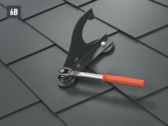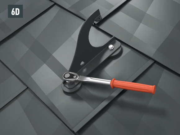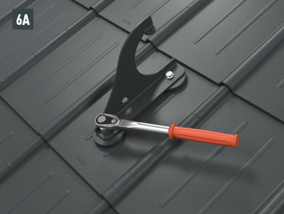 Mounting of the mountain snow guard bracket with two hexagon head screws (M12) to the foot parts (SW19; torque: 35 Nm) for roof tiles (Fig. 6A), shingles (Fig. 6B), rhomboid roof tiles (Fig. 6C), R.16 and FX.12 (Fig. 6D).