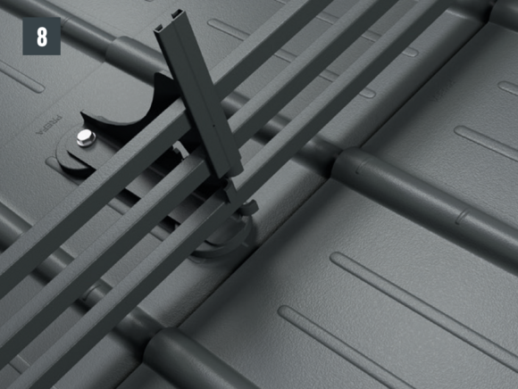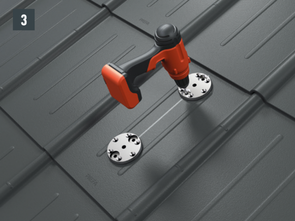 Snow guards are pushed up on the curved embossing on the fold and fastened with at least 2 grooved nails. The number of fastenings in the R.16 roof tiles is not influenced by the use of snow guards.