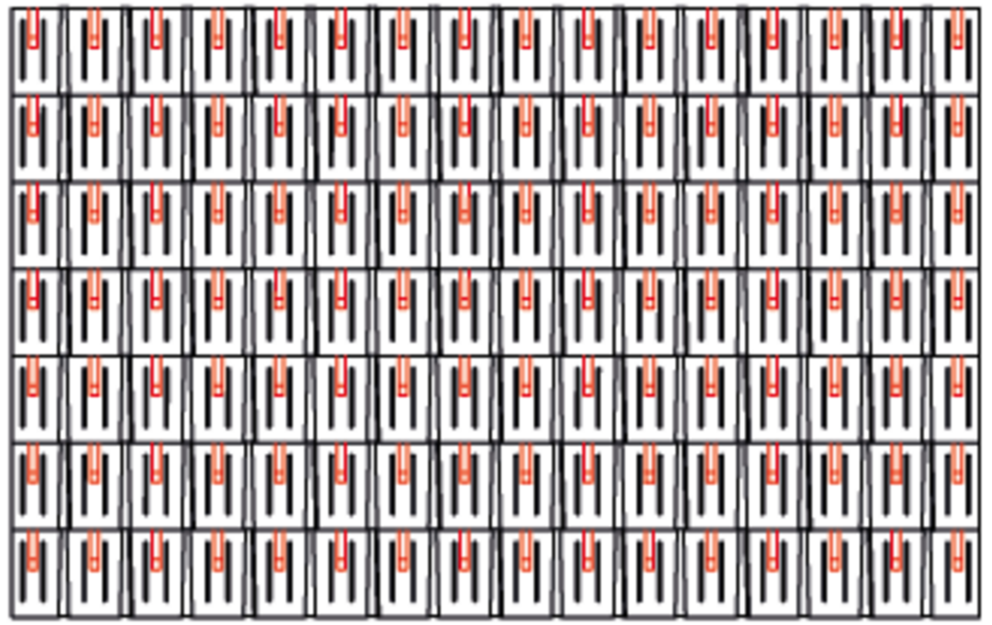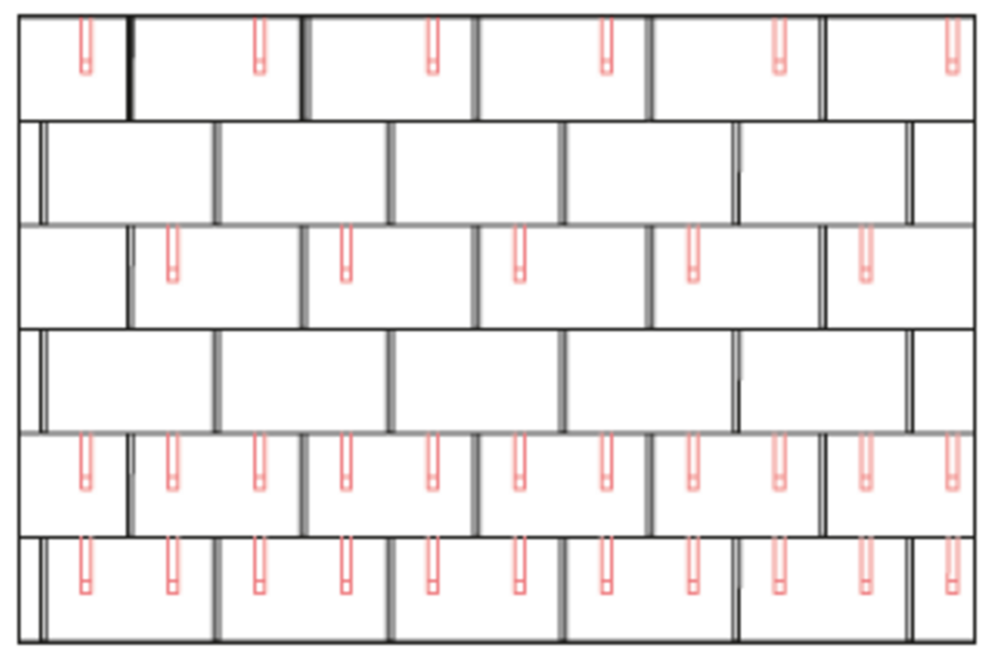 With R.16 roof tiles, 1.7, 3.4 or 6.8 snow guards are installed per m² (see table below - Installation patterns R.16 1, R.16 2 and R.16 3). The first two rows must be equipped with snow guards throughout.