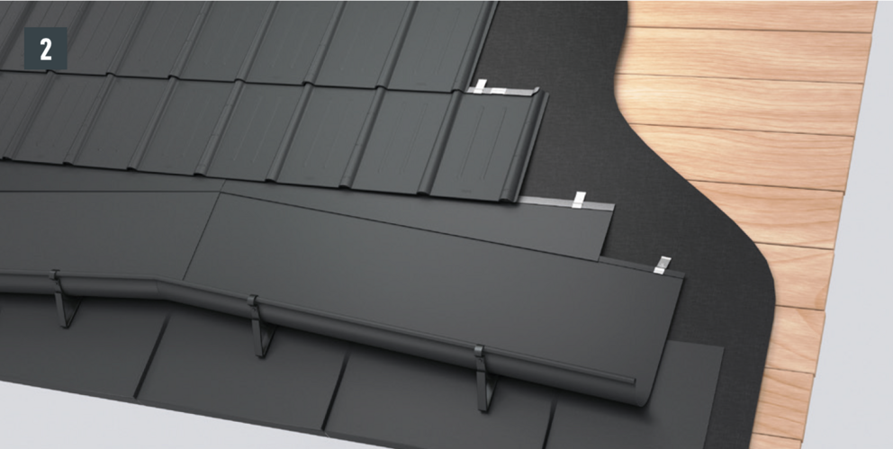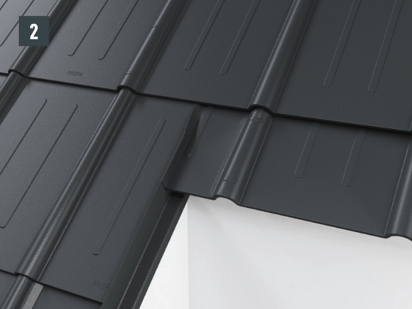 The covering direction should always be selected in the direction of thevalley. As a result, if snow and ice slides off in this area, the overlap groove is prevented from bending up.