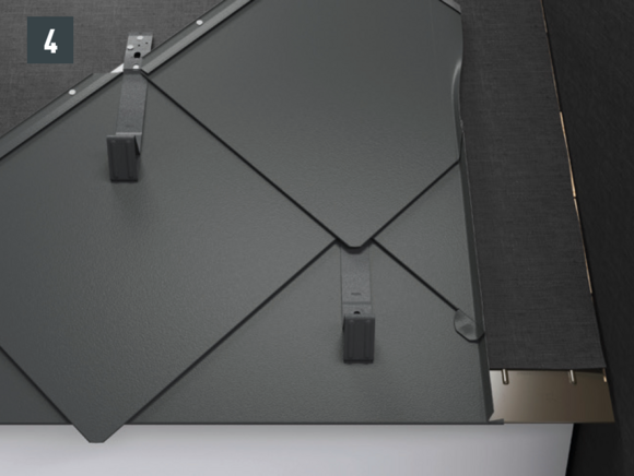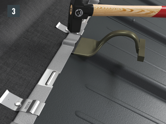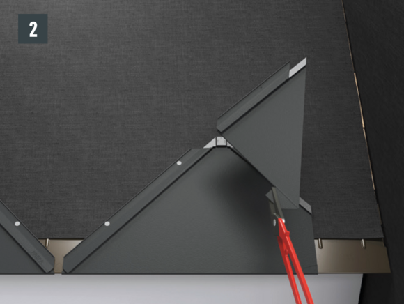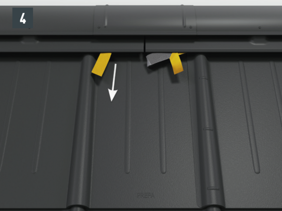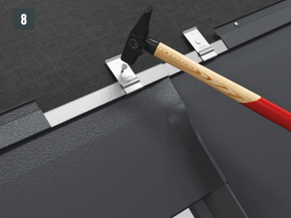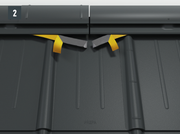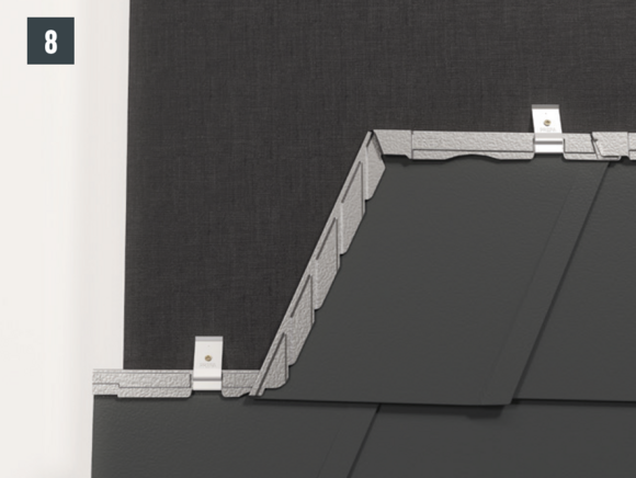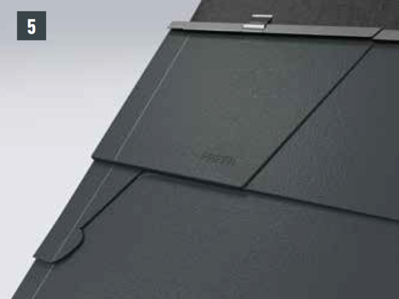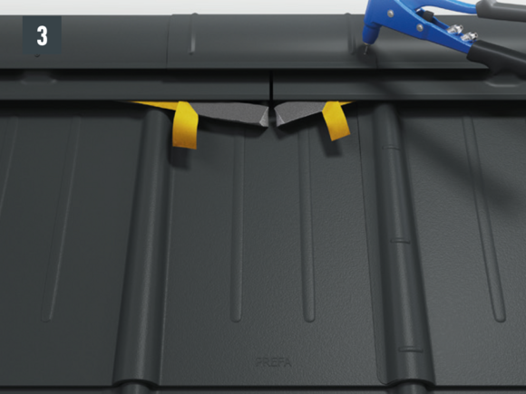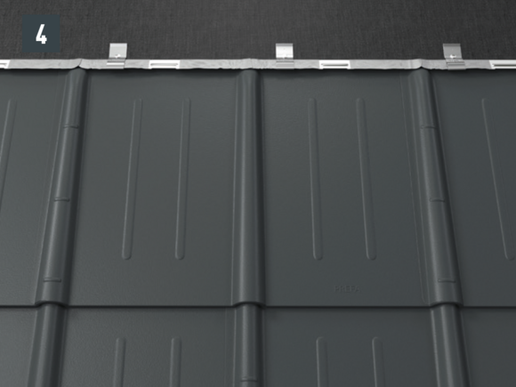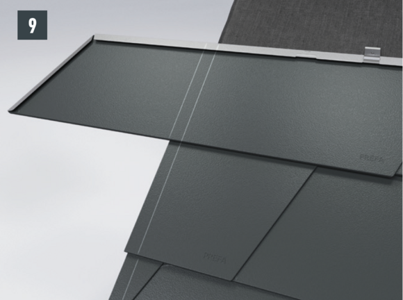 Fasten the last (cut, if required) row of tiles with a return clip, by means of a direct fastening to the side of the bead of the underlying bead (with PREFA roof panels) or by means of a direct fastening above the foam wedge of the jet fan.