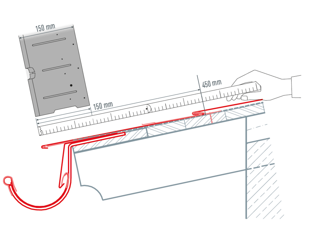 Measure from the planned top of the first roof tile 450 mm towards the eaves (ensure that the eaves overhang is between 30 and 80 mm). Make 150 mm (starter strip width) from below a mark (= starter strip width upper edge).