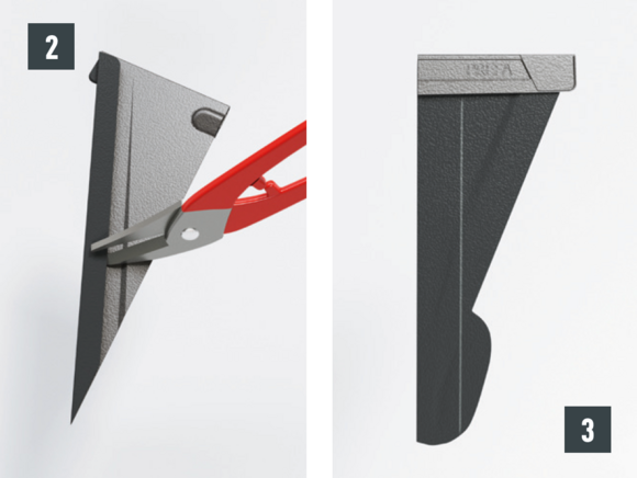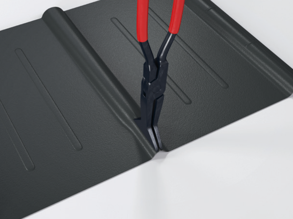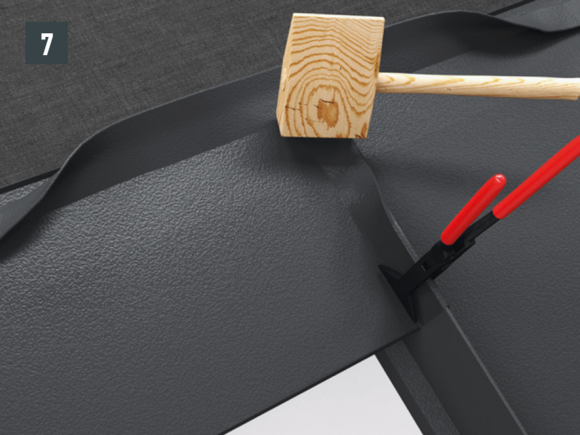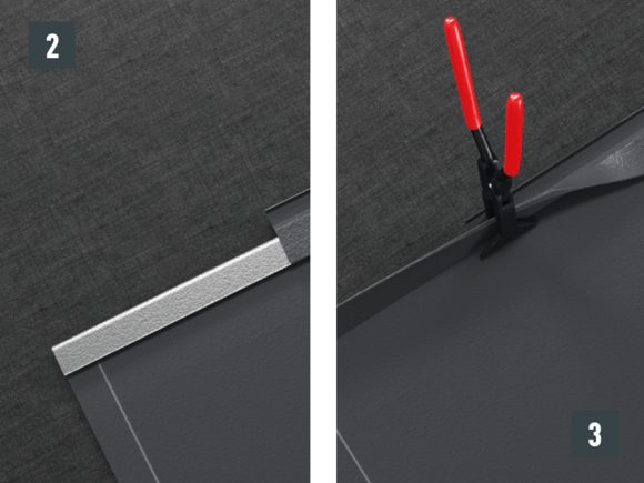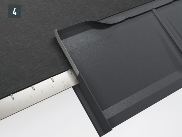 Notch the upper patent fold in the area of the raised edge so that a hook fold remains (Fig. 1 and 2), and bend the R.16 roof tile or the FX.12 roof panel upwards 30 mm at a right angle to the roof surface.