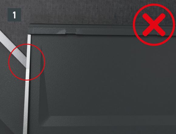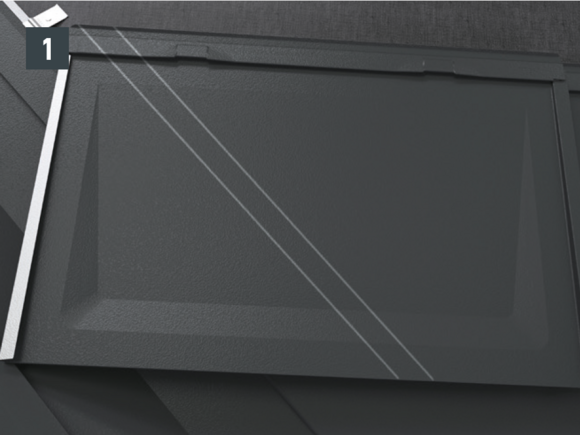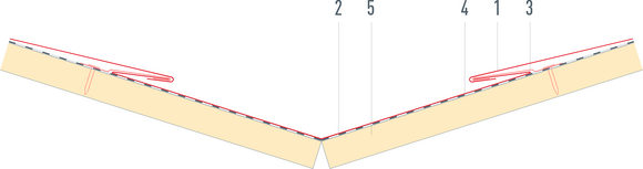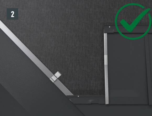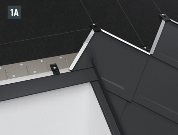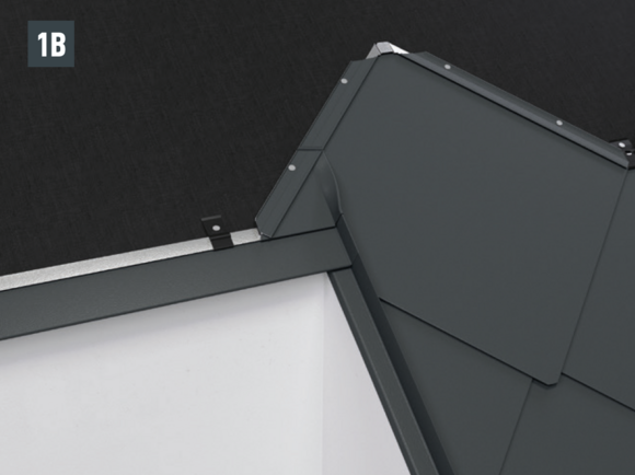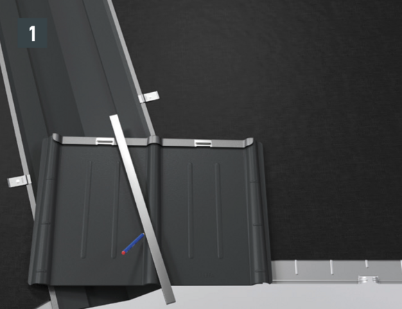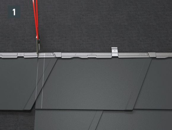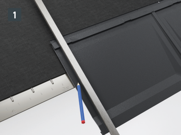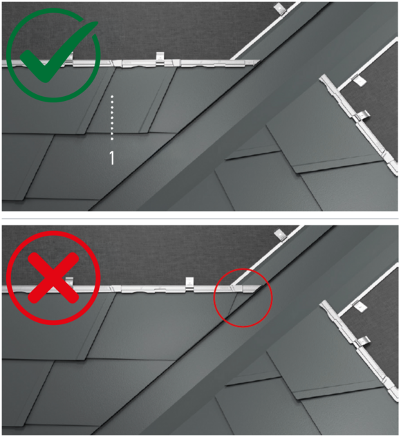 If the intersection point coincides with the valley on the left-hand side, a shortened shingle (1) or fitting shingle (1) must be assembled and installed.