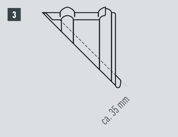 With each lateral upstand of the rhomboid roof tile 44 × 44 (verge flashing and edging), the folds running diagonally downwards are to be cut out and bent up on the underside.