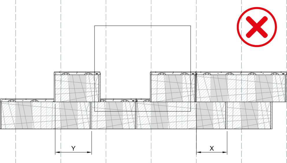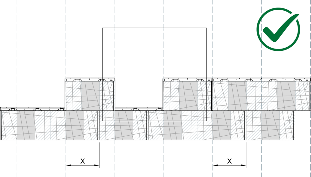 When installing the FX.12 roof panels, no angular fold may lie directly over another, a lateral offset of at least 220 mm must be observed. When combining large and small FX.12 panels, the joint of the first panel must be started in area “X” for each new row (see figure below).
