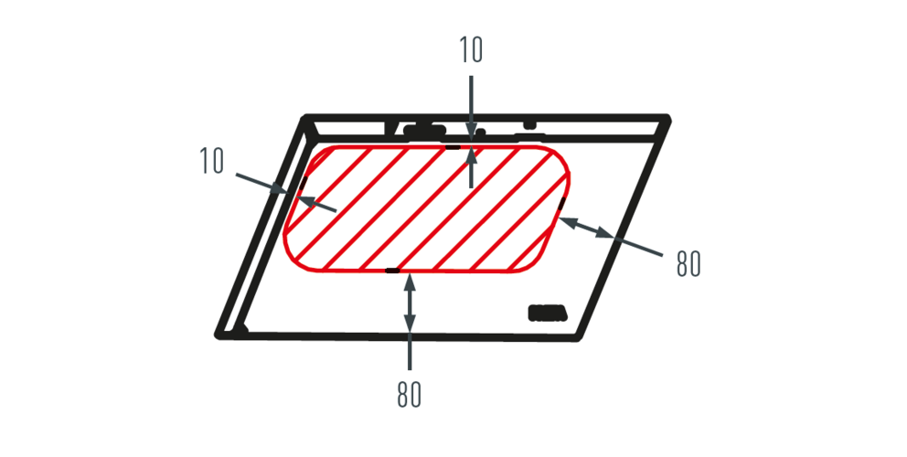 When installing roof accessory products, pay attention to the permissible installation area on the roof shingles. The figure below shows the installation area for accessory products on bases. Different installation areas may be defined for other accessory products.