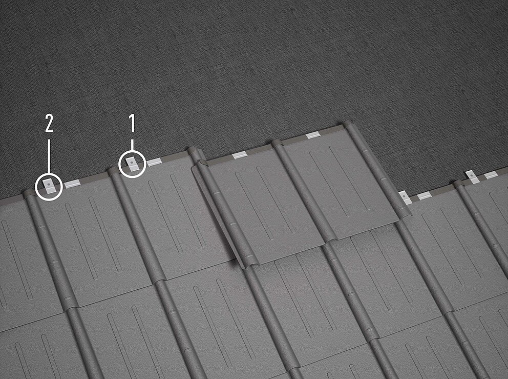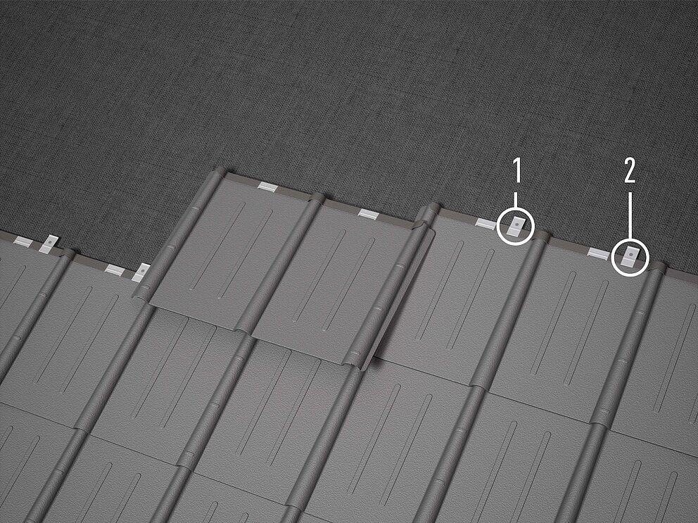 The clips must be set approx. 3 cm next to the panel groove. In areas particularly prone to storms, a wind load calculation is required and fastenings must be increased or decreased according to the calculation or screwed fastenings used instead of nailed ones. If the fastenings with an increased number of clips are not sufficient according to the calculation, an additional fastening can be attached to the side of the shaft outlet (underlying shaft) with 2 Half-round screws (4 × 25 mm) per panel are used. The clip arrangement depends on the covering direction. The patent clips for roof tiles and shingles are provided with an additional grain. This grain makes it easier to nail through if this is not possible with the given hole (e.g. because of a knothole, gap in the formwork).