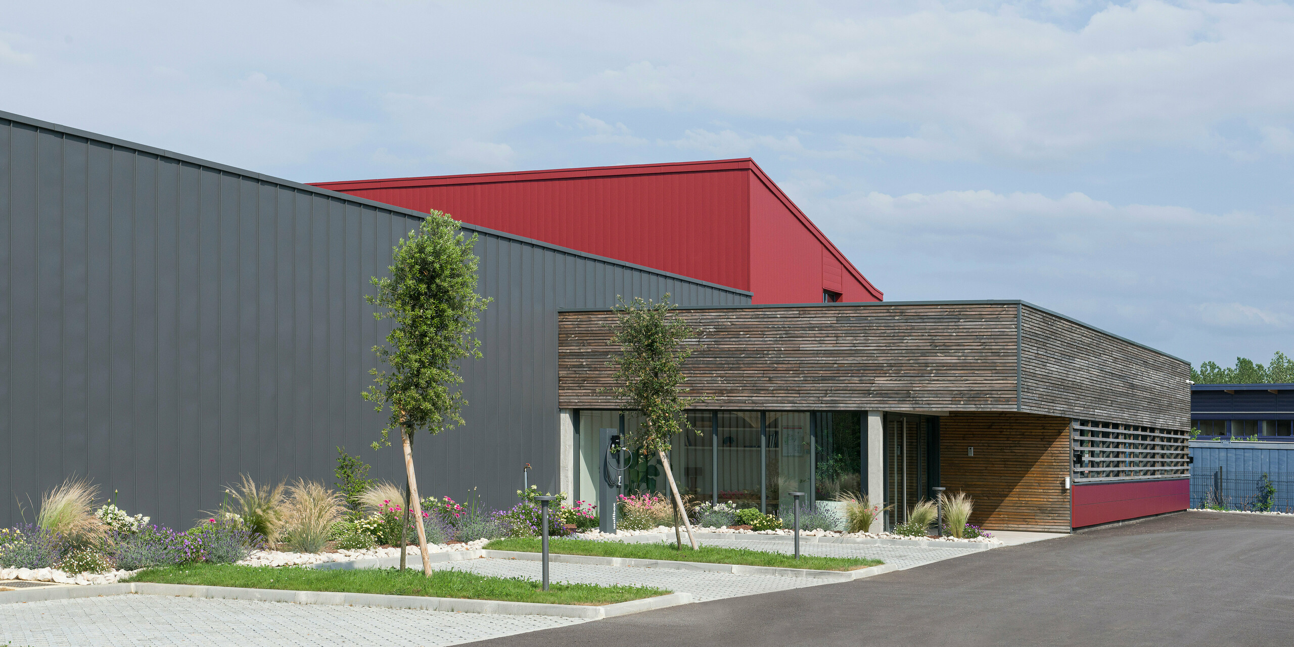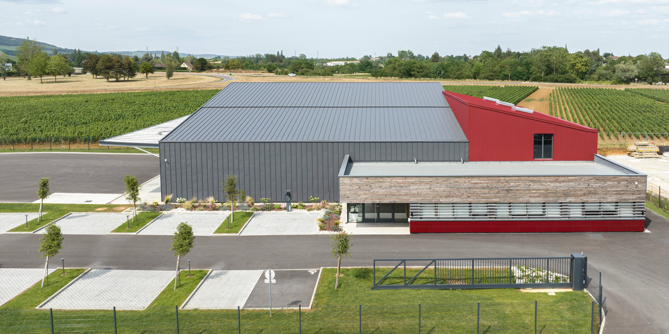 A remarkable mix of materials adorns the Pierre-Yves Colin-Morey winery. The harmonious integration into the agricultural landscape, paired with red accents, lends the building a dynamic yet discreet appearance. The PREFA roof and façade systems not only fulfil aesthetic requirements, but also stand for sustainable durability.